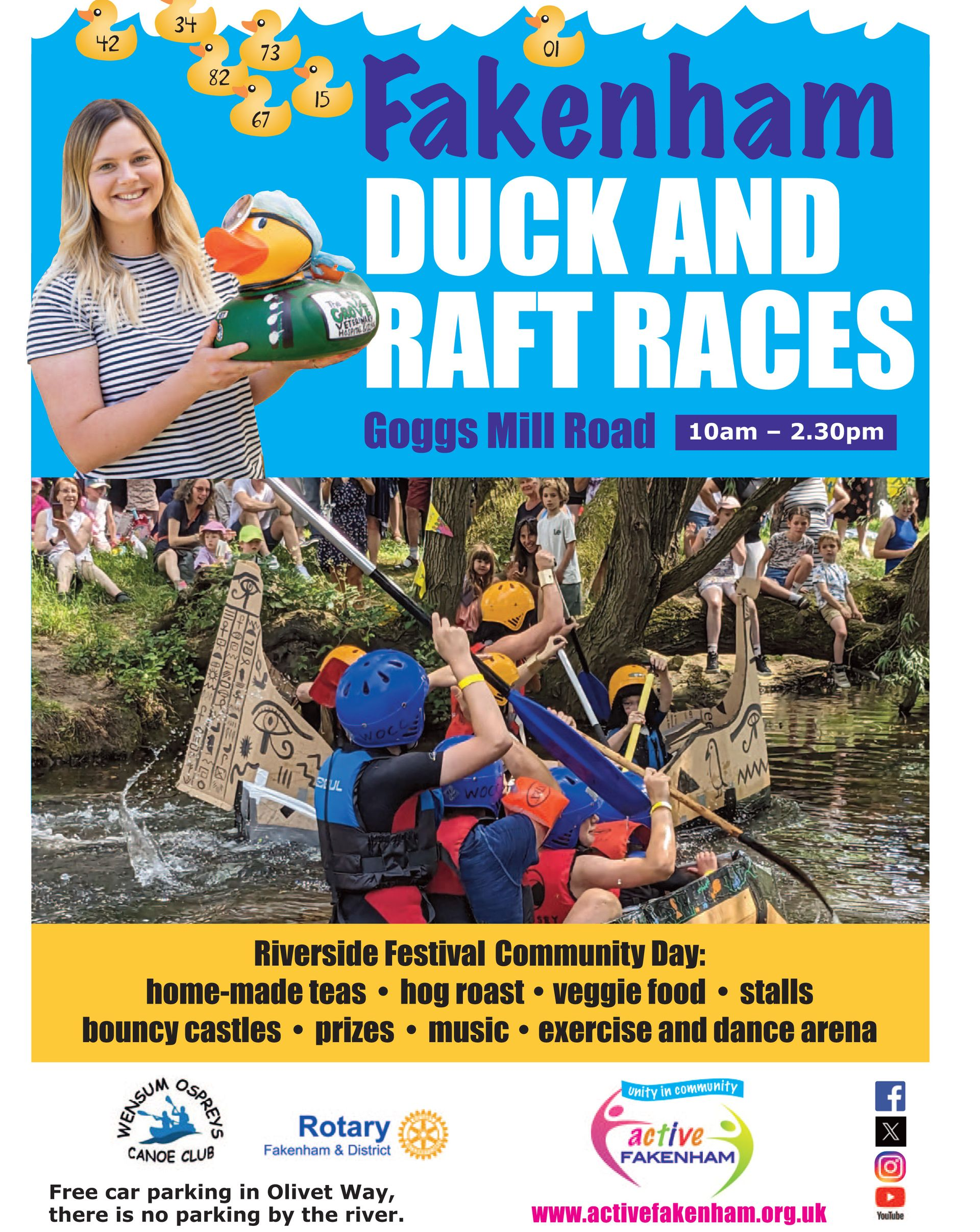 The Great Fakenham Duck Race is a free event open to the public. The race and picnic will be held at Goggs Mill from 10.00. It is part of the Fakenham Riverside Community Festival that runs from 10.00 until 2.30.