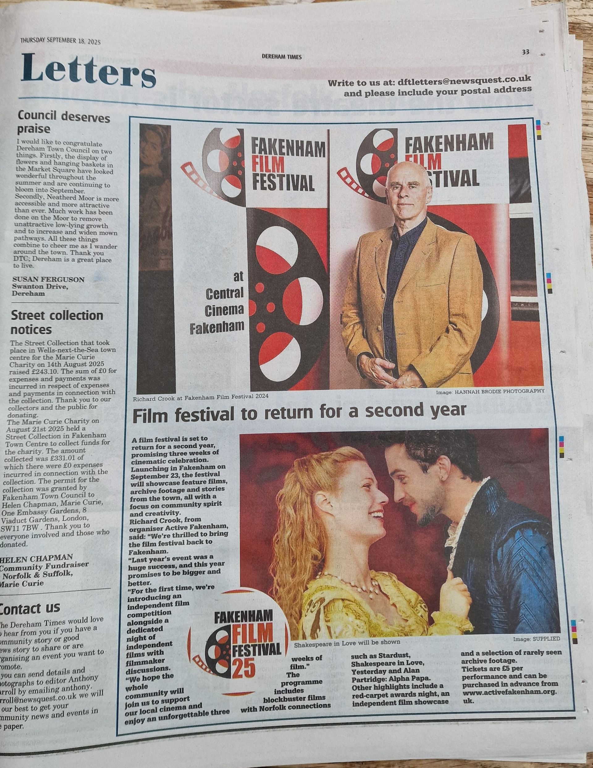 Fakenham’s much-anticipated second Film Festival opens on 23 September , bringing three weeks of film, community, and creativity to the heart of the town. Each evening of the Festival promises a rich mix of cinematic experiences – from blockbuster feature films with local connections to rarely seen archive footage and unique glimpses of Fakenham life on the big screen. Festival Highlights Feature films made in Norfolk – opening night kicks off with the magical fantasy adventure Stardust. Over the following weeks, audiences can enjoy classics such as Shakespeare in Love, Yesterday, and Alan Partridge: Alpha Papa – spotting familiar Norfolk landmarks along the way. Historic local footage – specially selected from the archives. Fakenham on film – events and stories from the town, starring local people. Independent film showcase – with live discussions and Q&As with filmmakers. Film competition & Red-Carpet Awards Night – an exciting new addition this year, featuring films with a Norfolk connection. The glamorous awards ceremony is open to everyone.